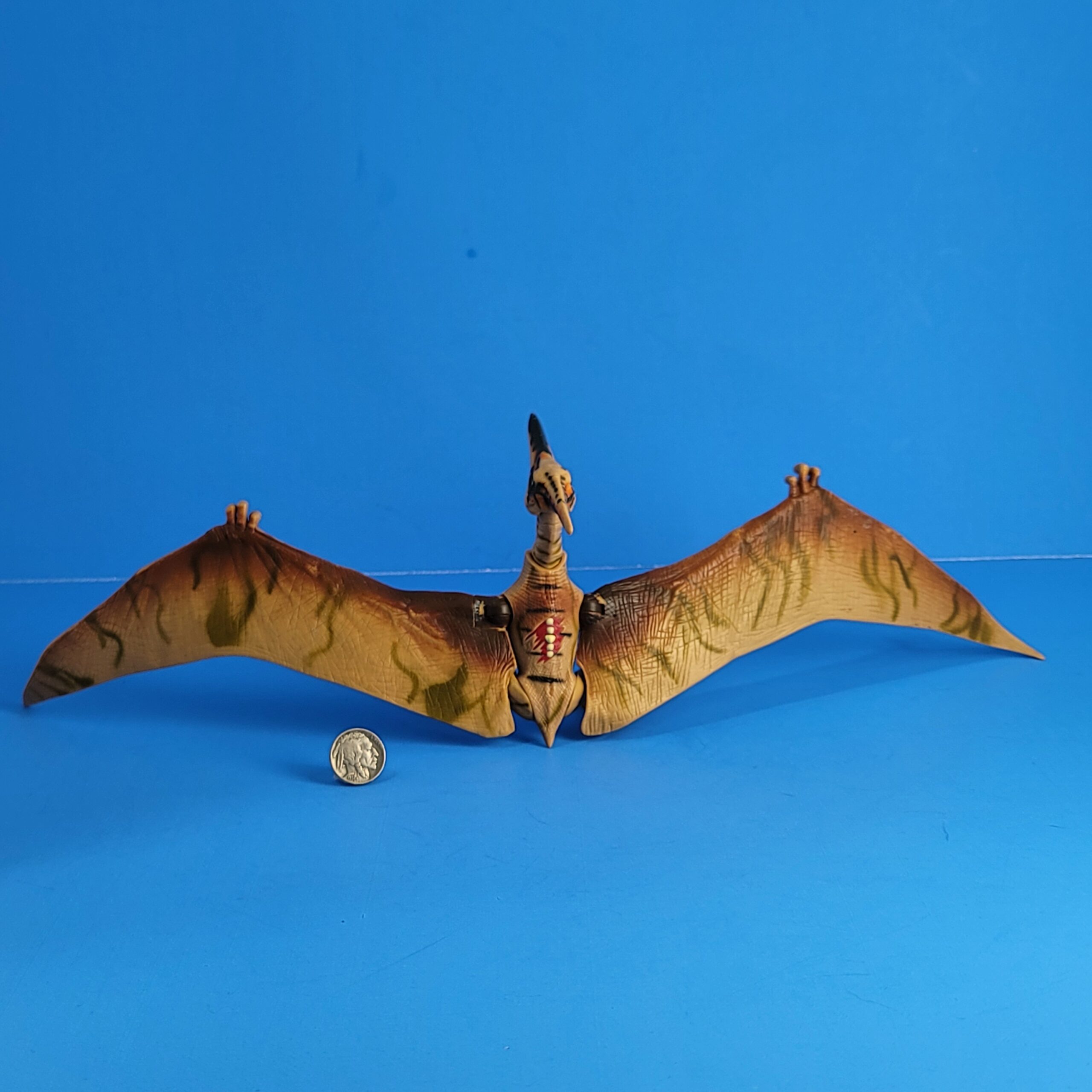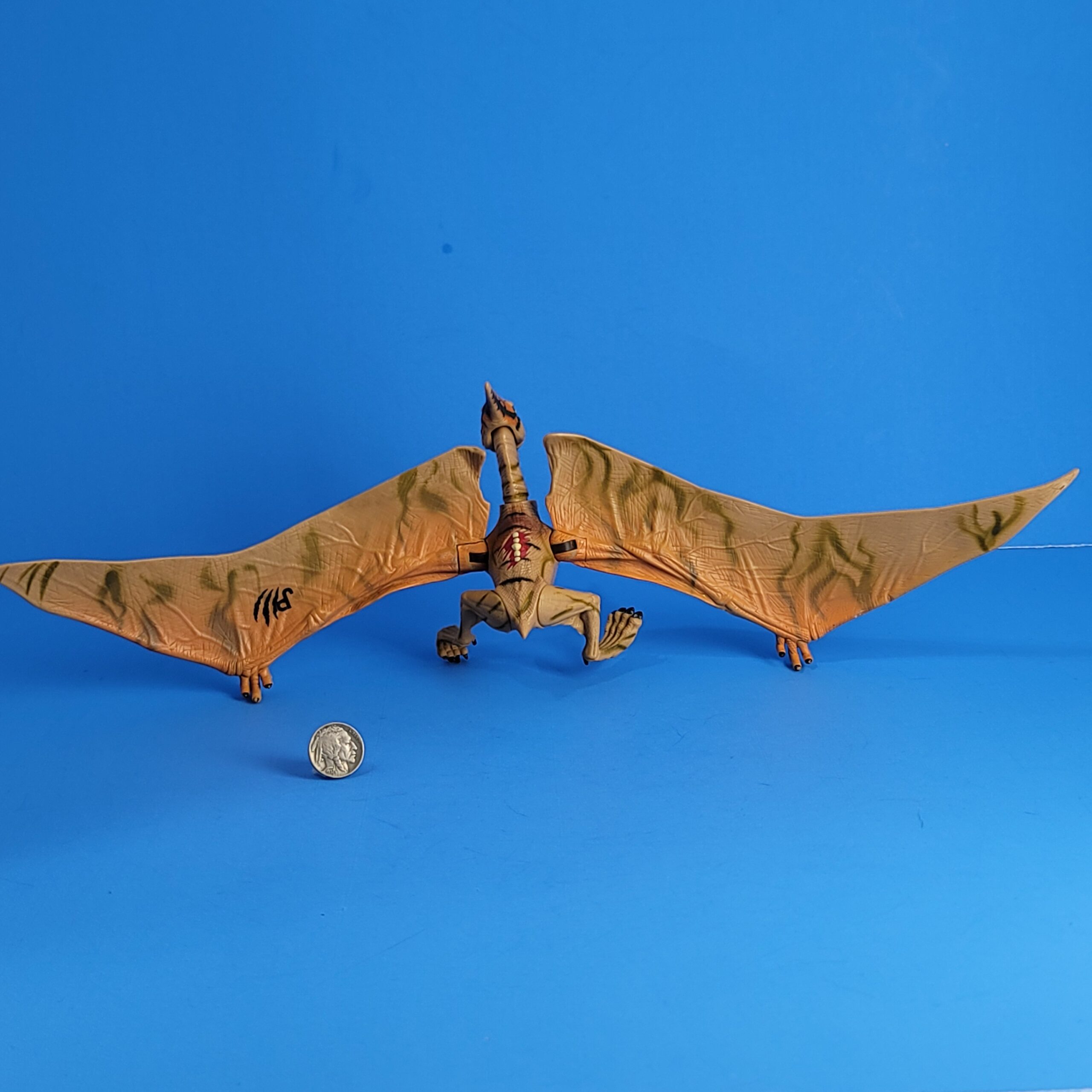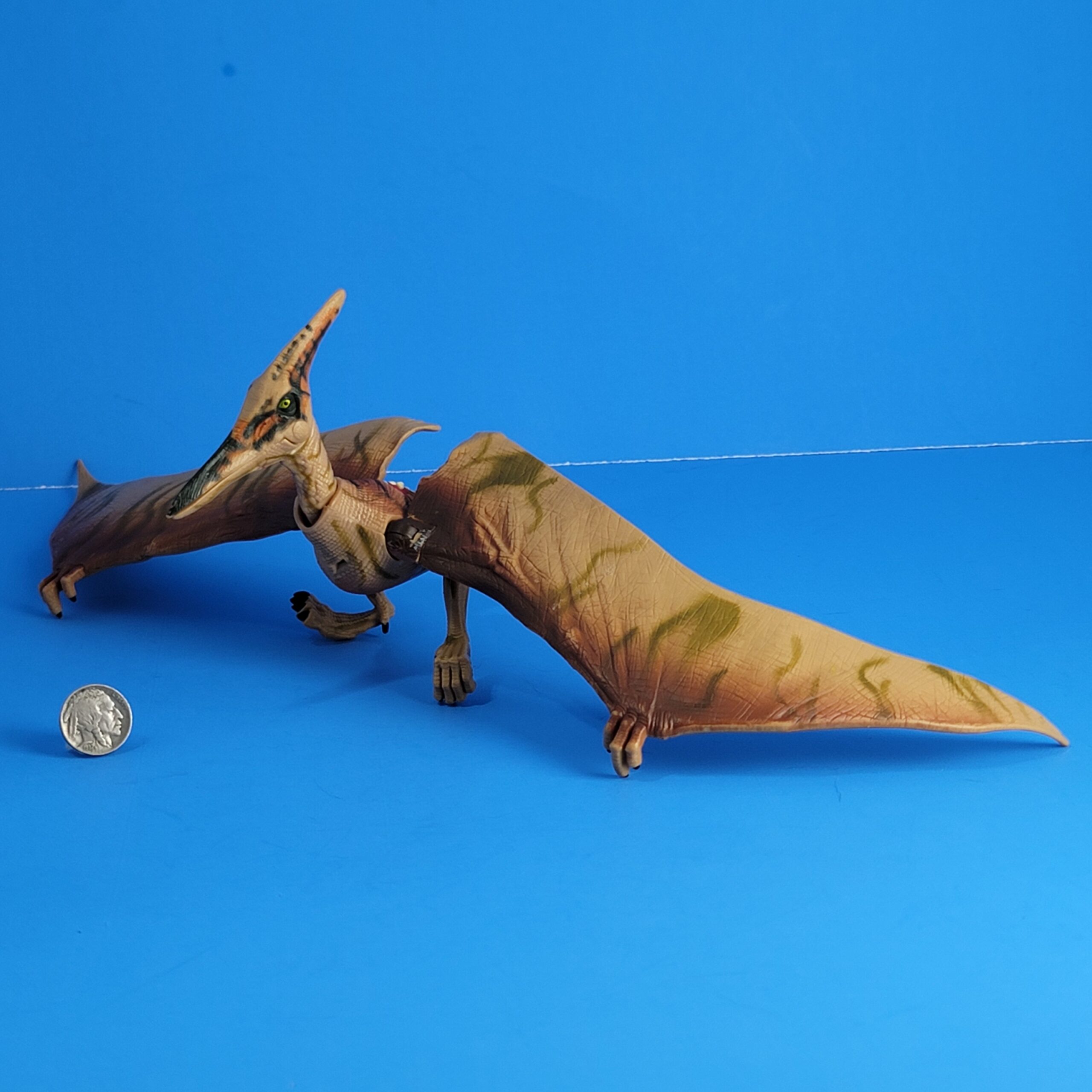 A medium sized Pterosaur model with a wingspan of almost 40 centimetres. It’s mostly tan coloured, with some brown and green paint on the wings, including a JP III logo on the underside of its left wing. It’s got some black stripes on its back, as well as a dino damage wound: a red spot with some white points in it, making it appear as though this animal has been injured. The head has some orange and dark green spots on it, and its eyes are yellow. Three small fingers stick out of each wing, and it has a very small tail. This Pteranodon has two legs.