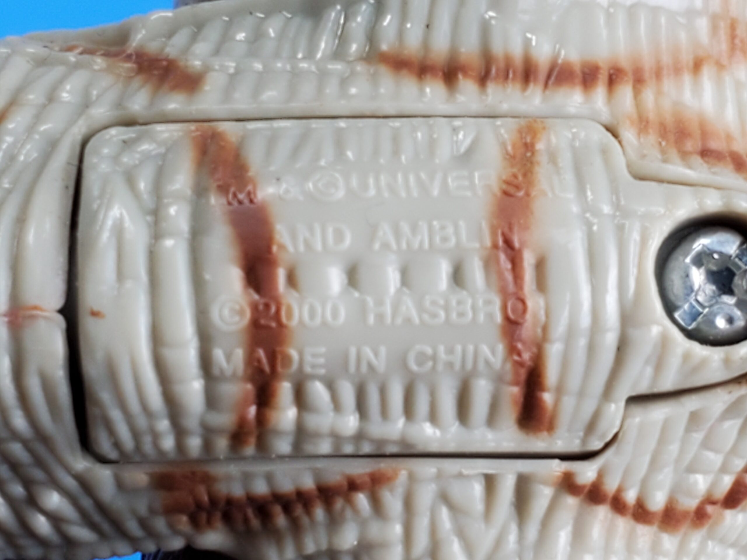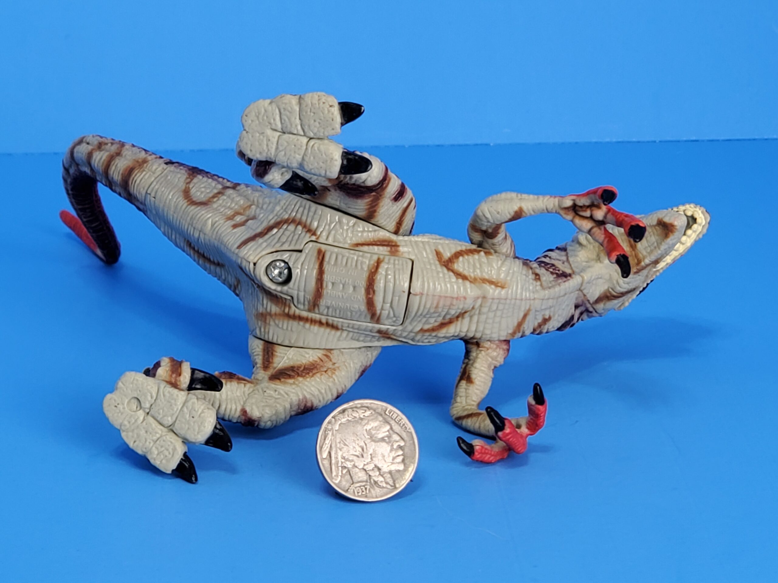 The wound is all red with one white button in the middle. By pressing the button on its throat causes the mouth to open, as if making a biting move.