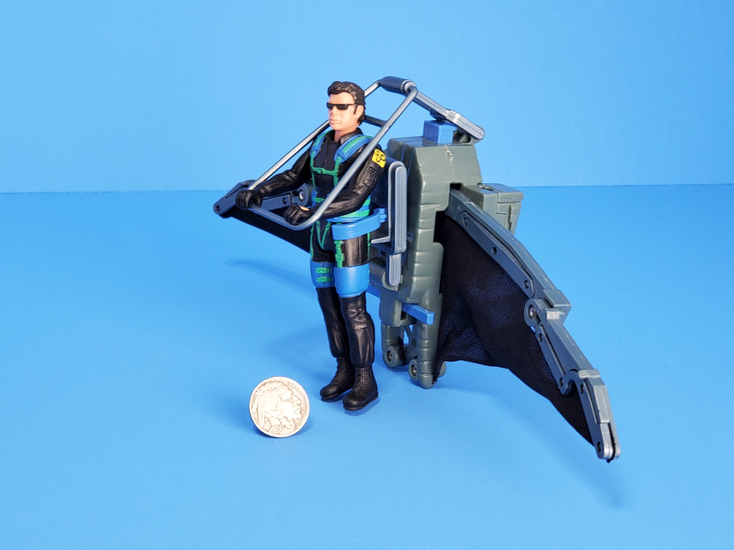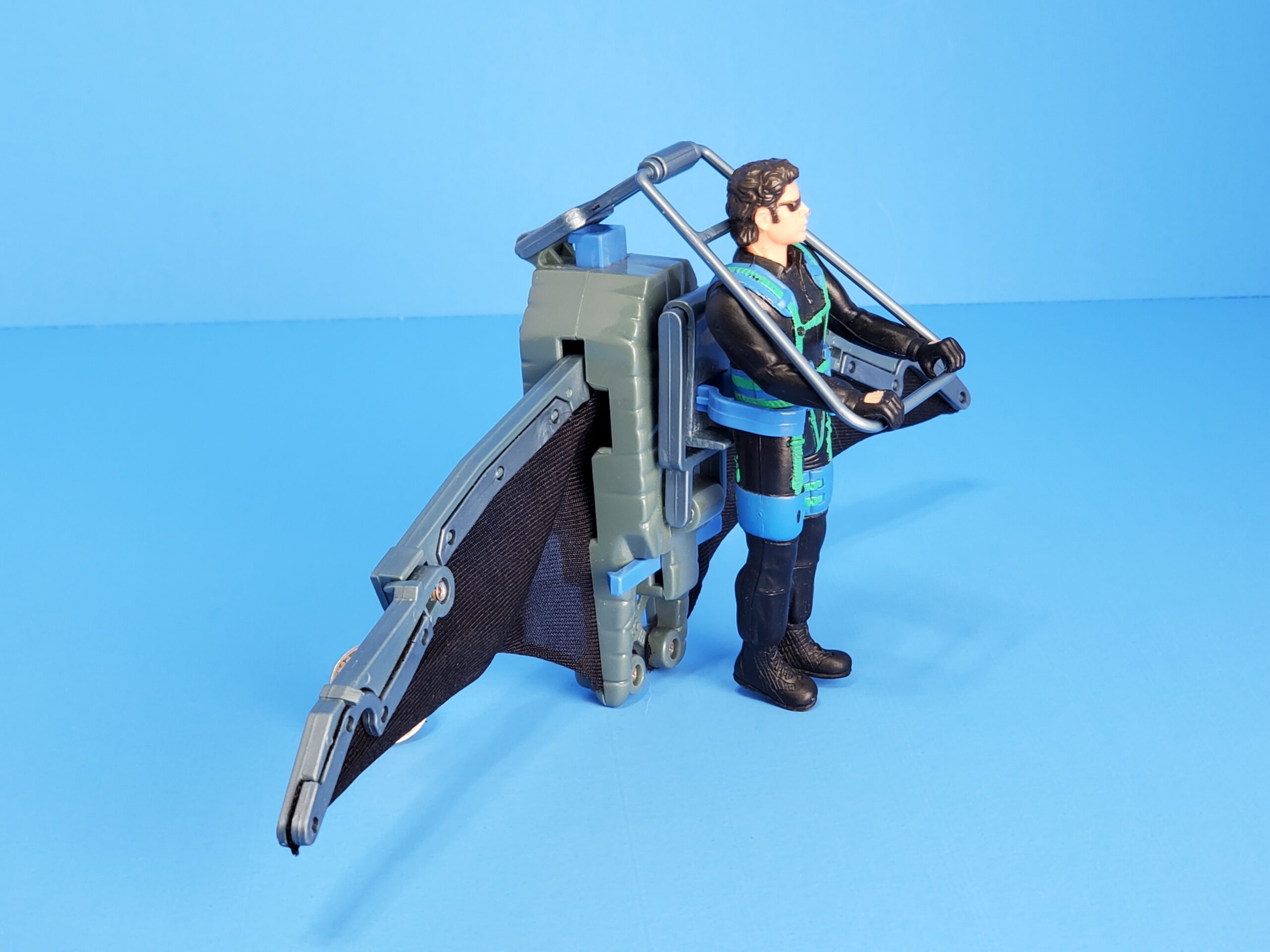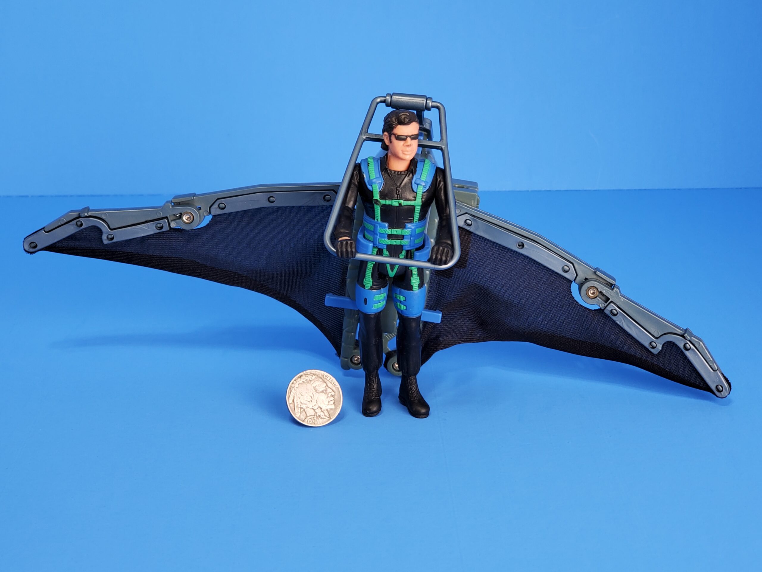 Action feature: Glider wings burst open! Launch rocket for aerial dogfight! Includes exclusive Ian Malcom action figure. No missile.