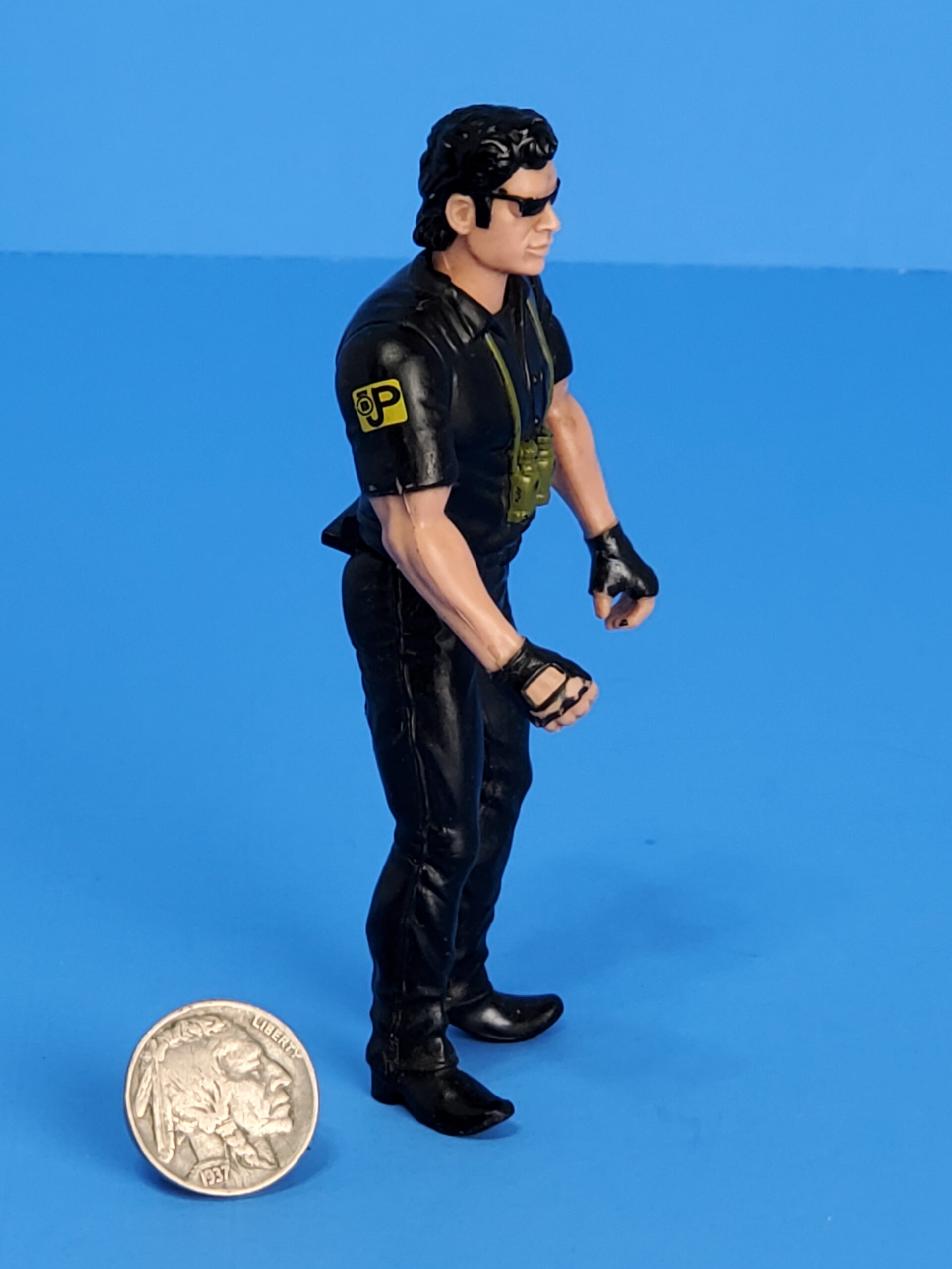 This Malcolm figure sports a typical black outfit like Malcolm usually does. Shirt, trousers, gloves, sunglasses, belt and shoes are all black. He’s got some equipment on him, consisting of a green pair of binoculars on his chest, a brown knife on his upper left leg, and a JP Site B patch on his right shoulder.