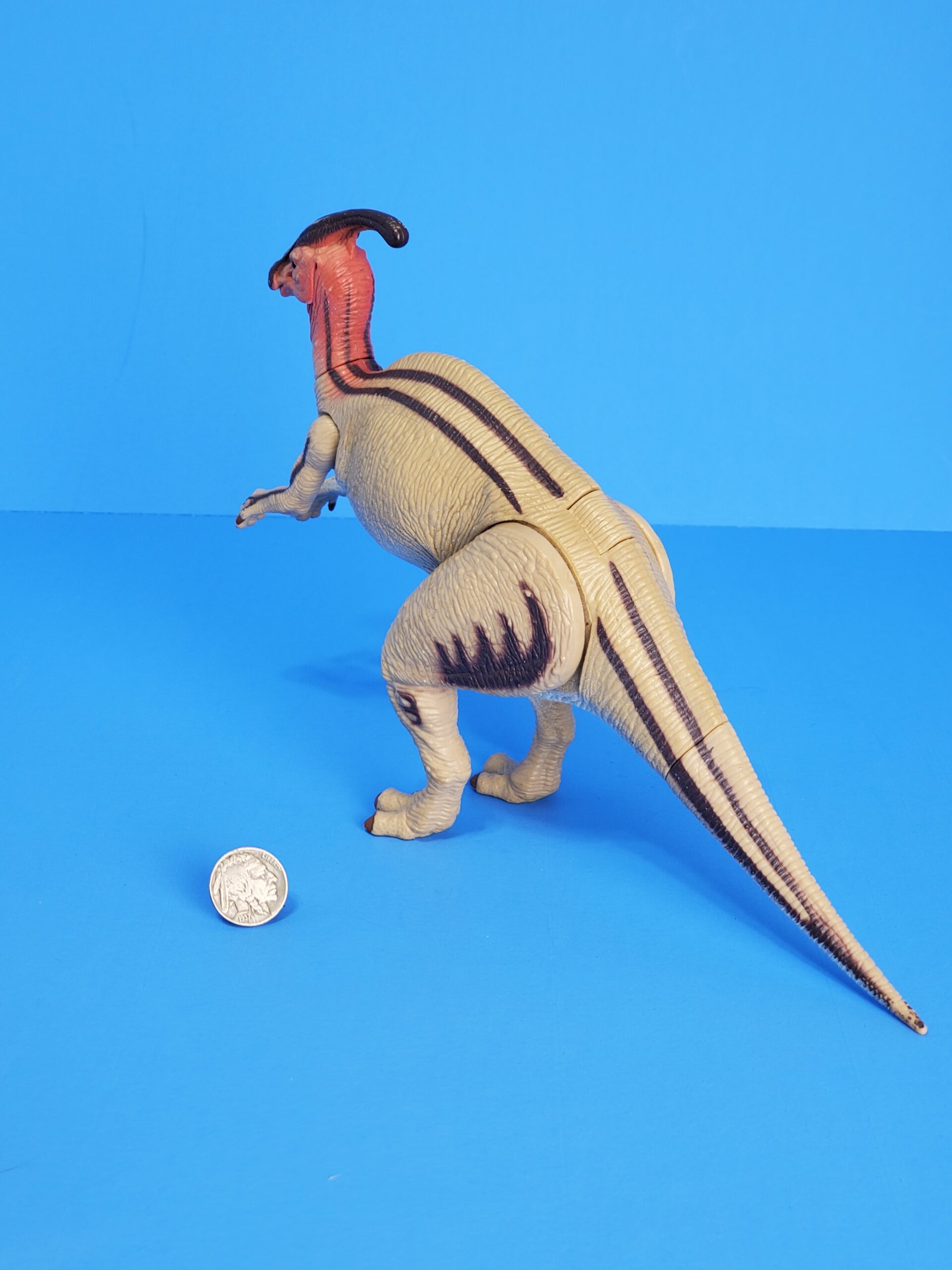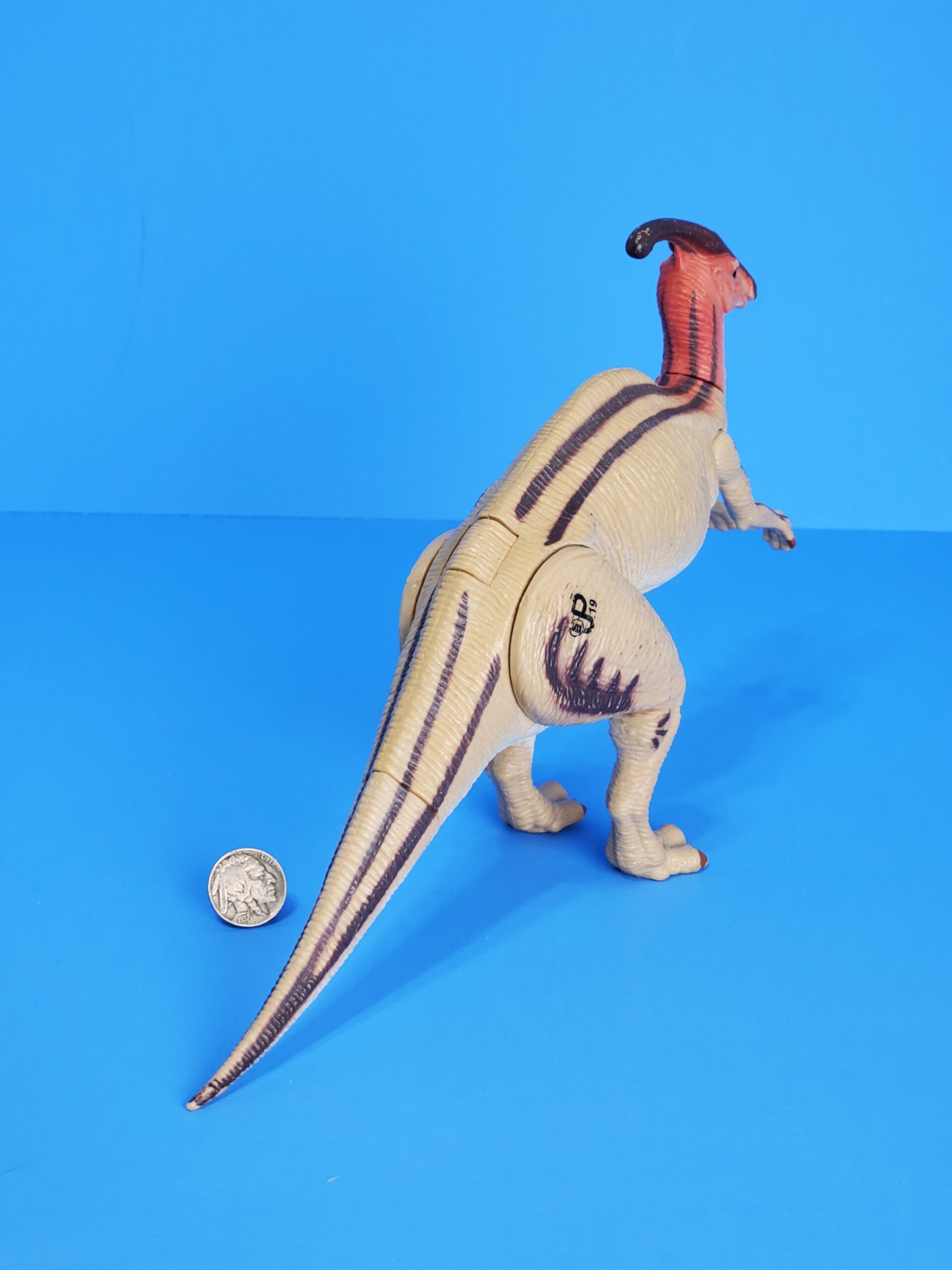 The figure is covered in a mostly beige paint job, with its underside (belly, inner arms and legs, lower part of the tail, throat) coloured white. The head and neck sport red colours, with four long dark brown lines stretching from the back of the head all the way to the tip of the tail, stopping only around the button on its back. Additionally, spots and stripes of the same dark colour adorn the back of the upper legs as well as part of the lower legs, the arms and two fingers on each hand. The claws on each finger (8 in total) and toe (three on each foot) are painted brown. The beautiful crest on its head, which basically starts at the upper jaw, is coloured in an almost shiny variant of the aforementioned dark brown colour, with three beige stripes on top of it. A black JP: Site B logo is found on the right upper leg, along with the number .19. Its eyes are totally black.