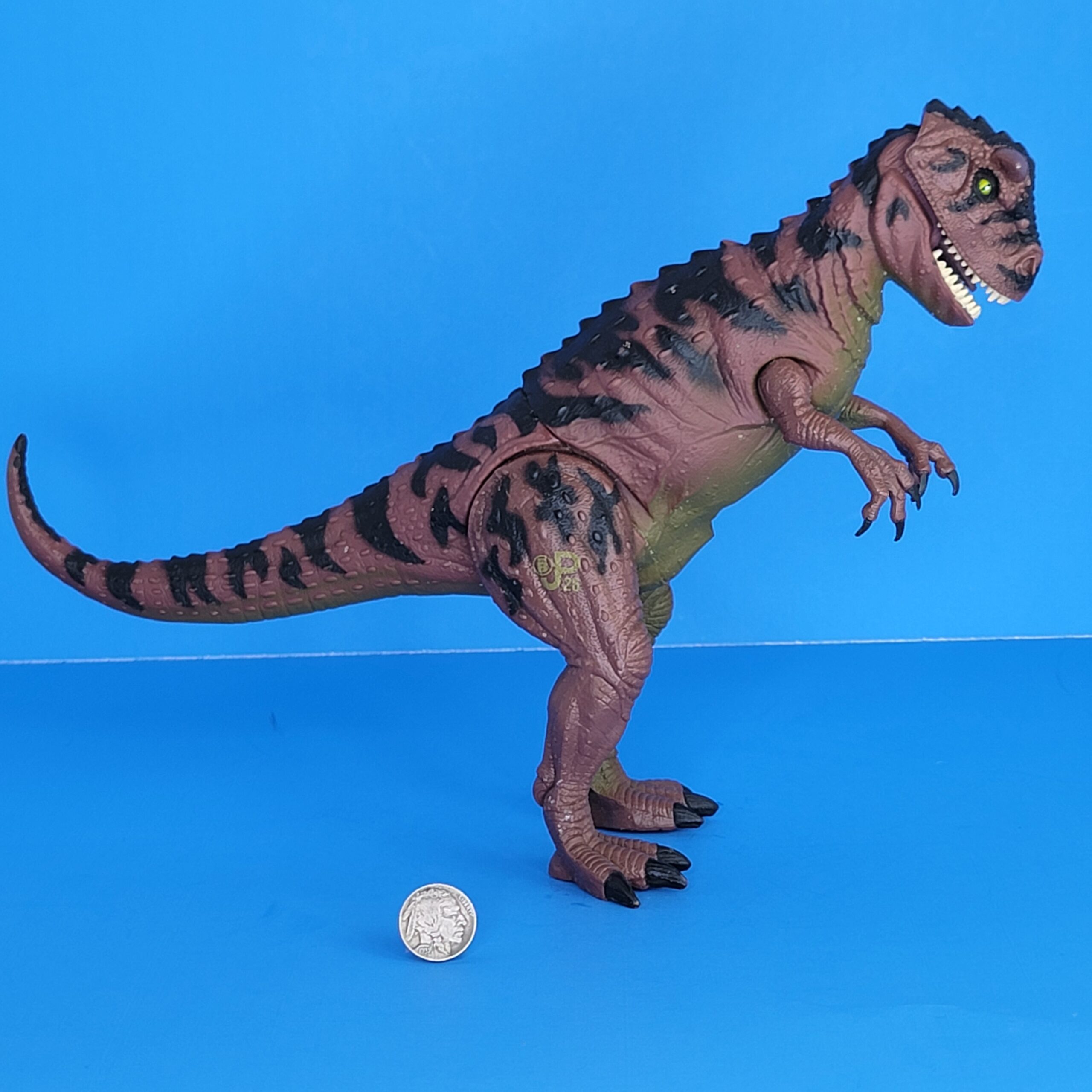 The figure’s predominant colour is dark red, which is found on almost the entire head, its back and flanks, the arms and legs and the upper part of the tail. Black stripes adorn this red paint job in a chaotic pattern, running over the back and upper legs as well as the head and tail. Its claws too are black, except the ones on the sides of the lower legs (notice he has two of these on each leg, instead of the usual one). The underside of the beast (its belly, inner part of the limbs, lower part of the tail and throat) sports a sickly green paint job. It has very bright green, cat like, eyes. On its right upper leg a dark yellow JP: Site B logo is found, along with the number .26.