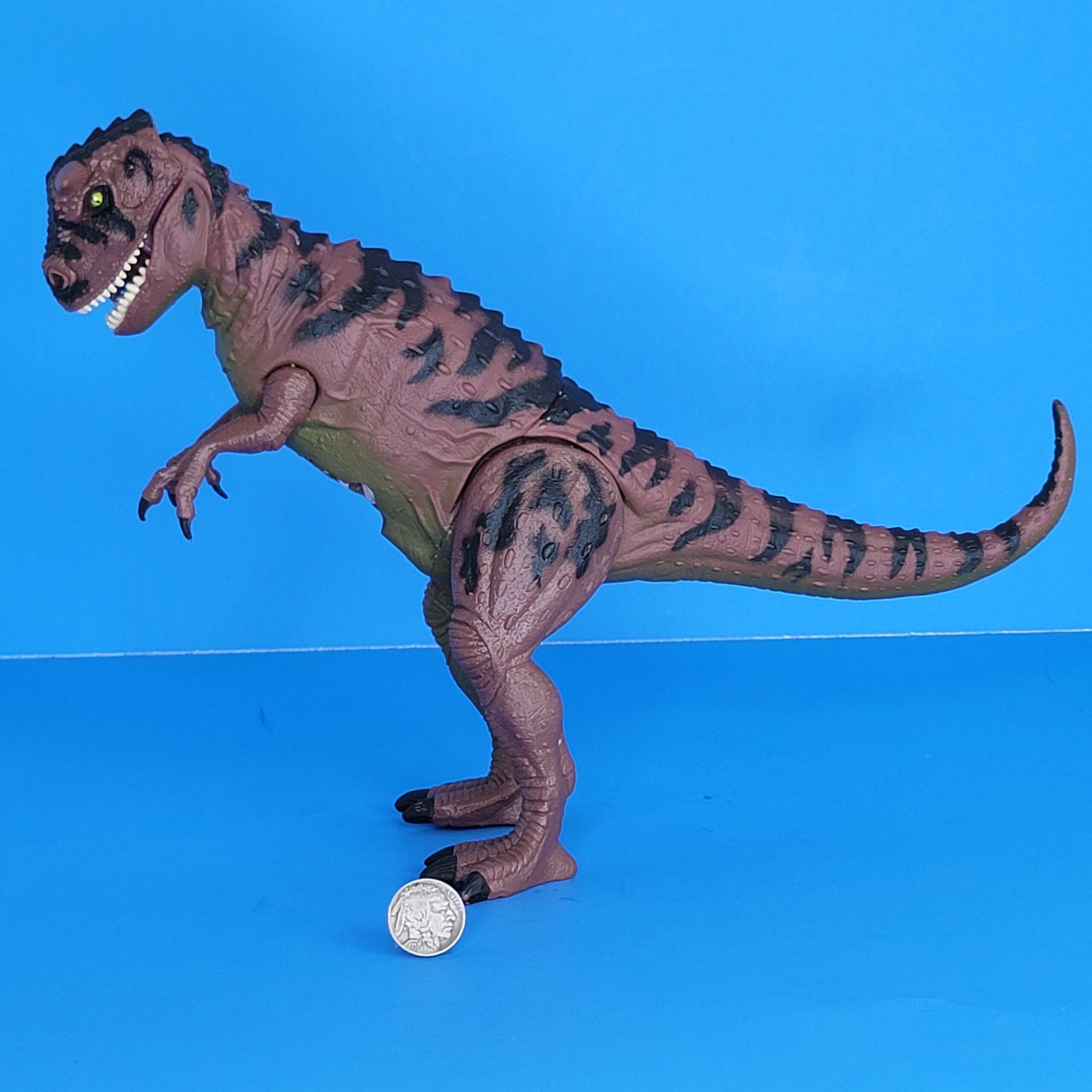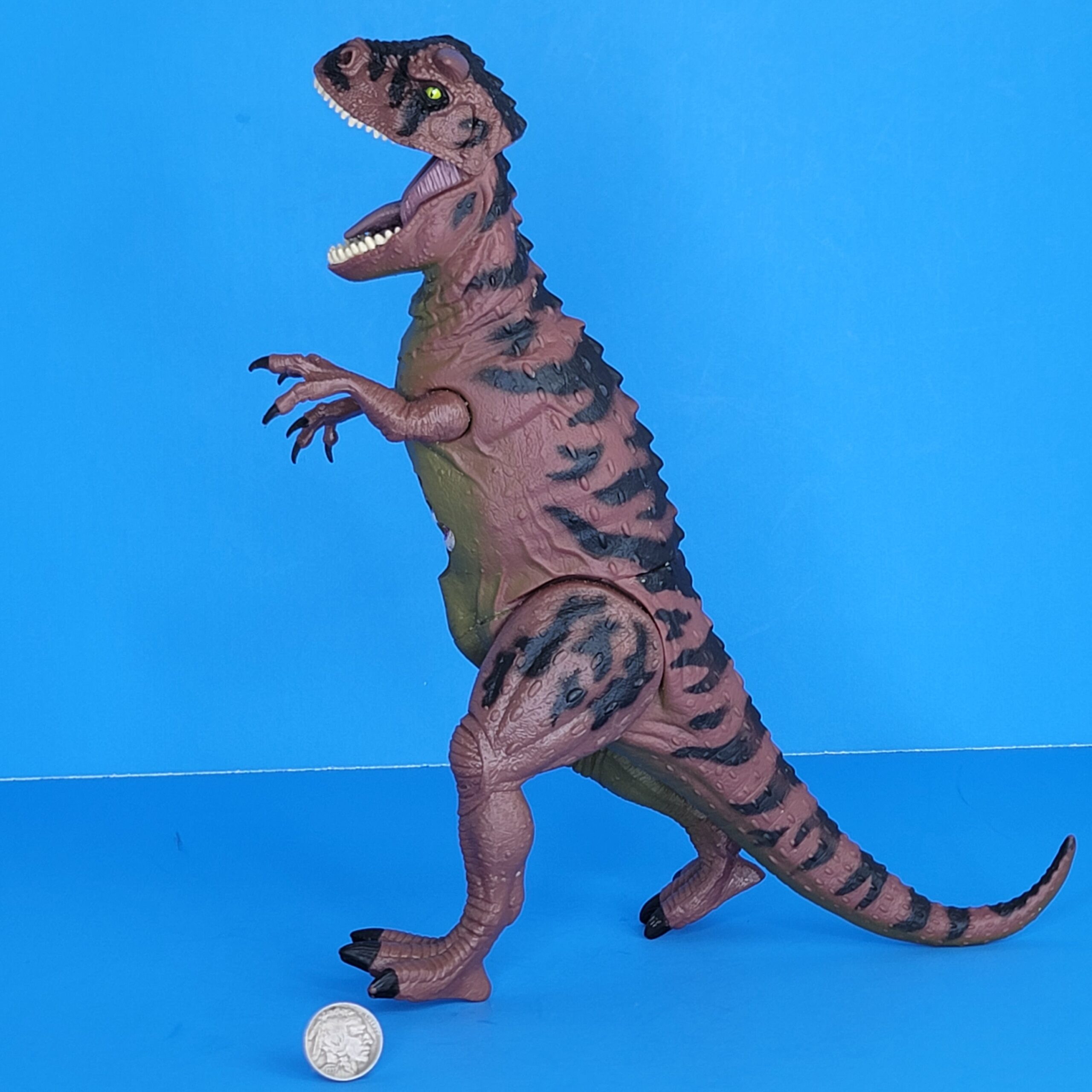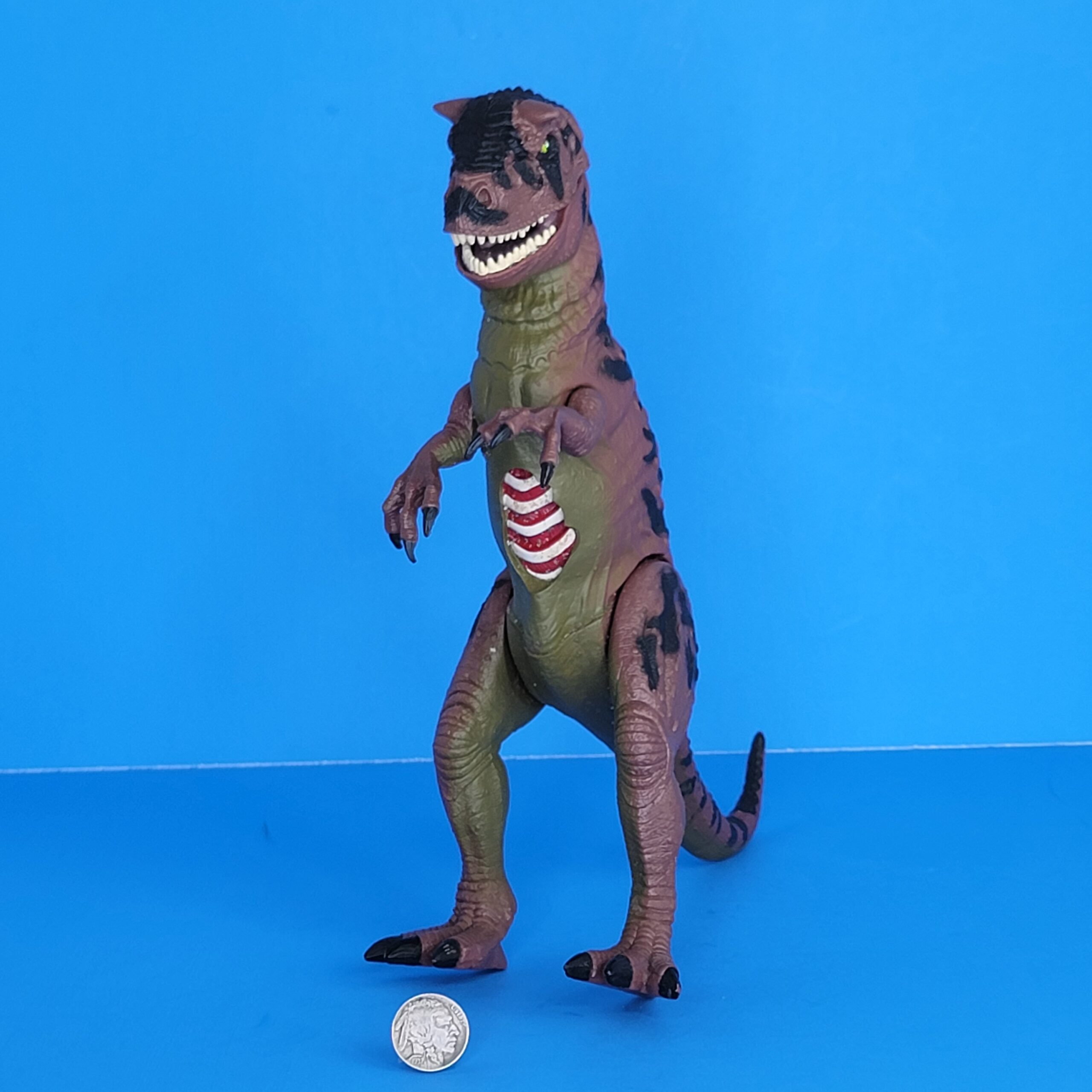 Description: this carnivore stands in a neutral pose, tall on its hind legs with its tail raised high above the ground. This dinosaur comes with a chomping action: pulling the right leg back causes the upper jaw to move upwards, making the mouth open very wide. Pushing the leg back makes the mouth close again. The creature has damage wound on its belly: dino damage piece not included, no capture gear, only dino.